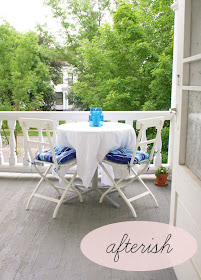 Aaaaand I've gotten this far. Which is great! And especially for the price: just about $100 for the table, chairs, chair pads and candle (all from IKEA). It's functional, simplistically sweet, looks crisp and leaves lots of room for moving about the porch.